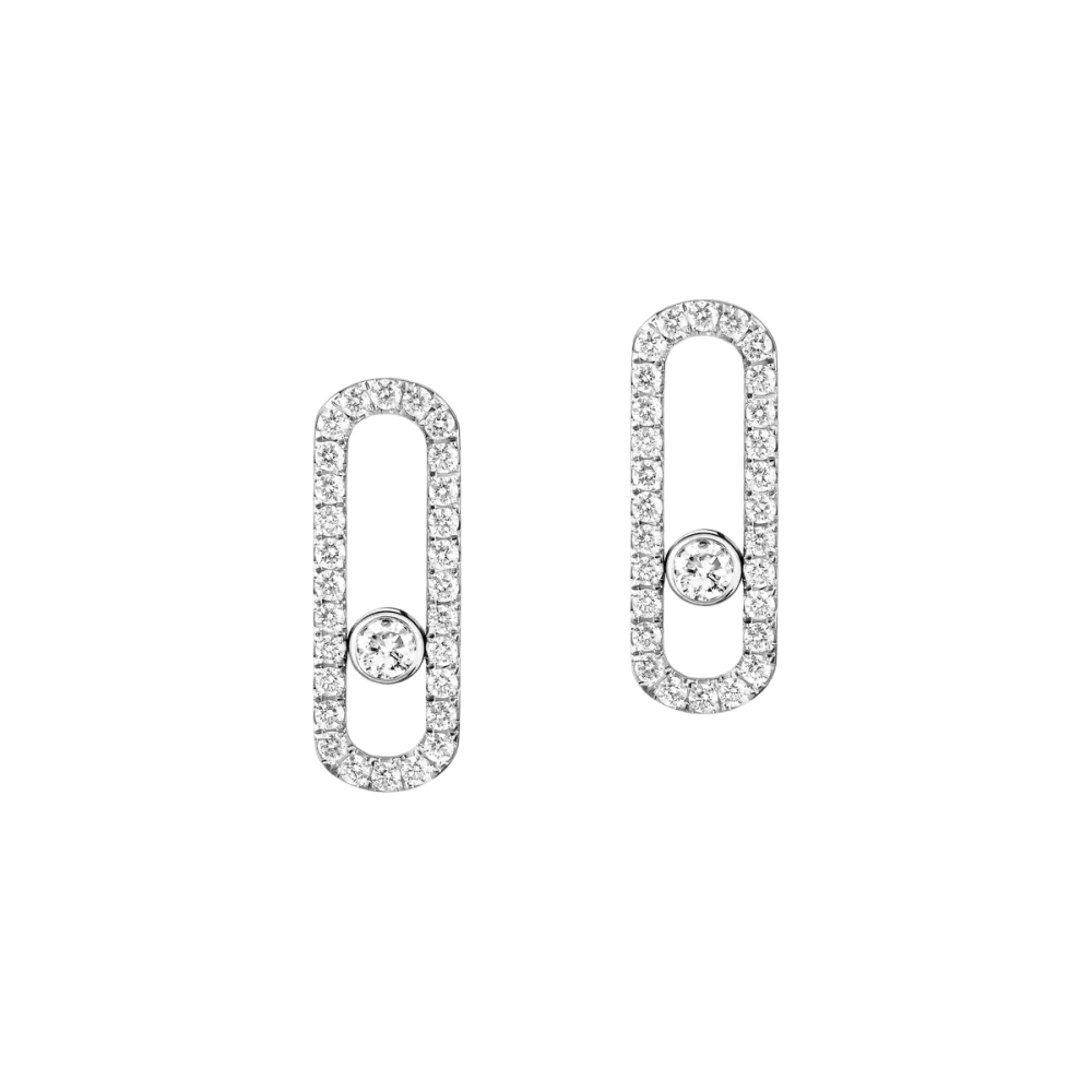 Die mit Diamanten ausgefassten Move Uno Diamantohrringe sind auch in Roségold und Gelbgold erhältlich.