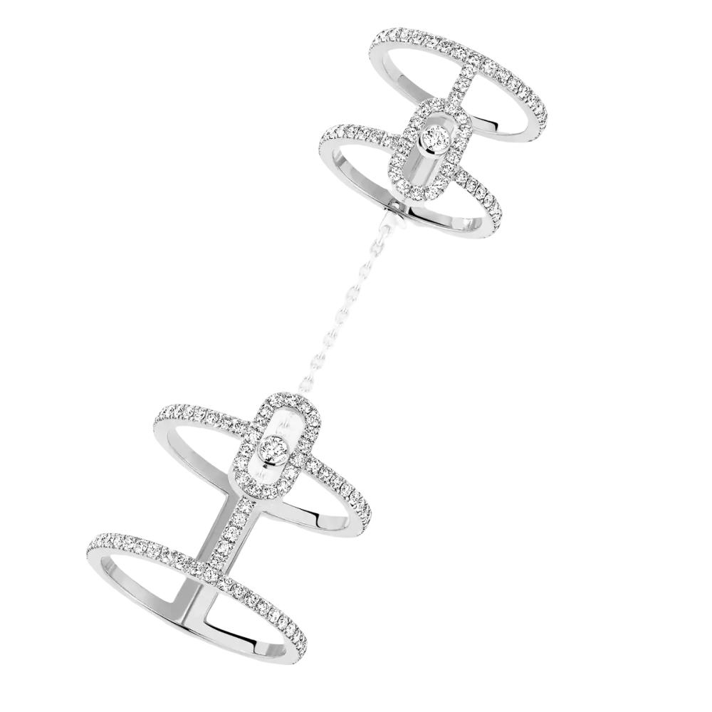 Avec cette bague de luxe, vous ne passerez sans doute pas inaperçu(e)s. Inspirée de l'emblématique création Glam'Azone et ses portés multiples, la bague diamant double Move Uno reprend l'iconique motif Move et son diamant mobile pour une création 3-en-1. Le bijou or et diamant à la structure fine et ajourée est pavé de diamants. Sa particularité ? Deux bagues en or blanc reliées entre elles par une chaîne amovible pour être portées ensemble ou séparément en fonction des envies. La main est sublimée par ce néo porté original où les diamants semblent flotter sur le doigt.