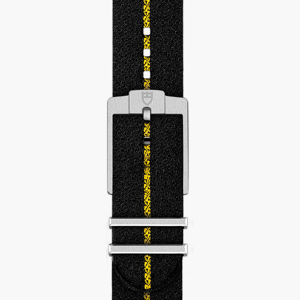 Bracelet en tissu noir avec bande jaune et boucle ardillon