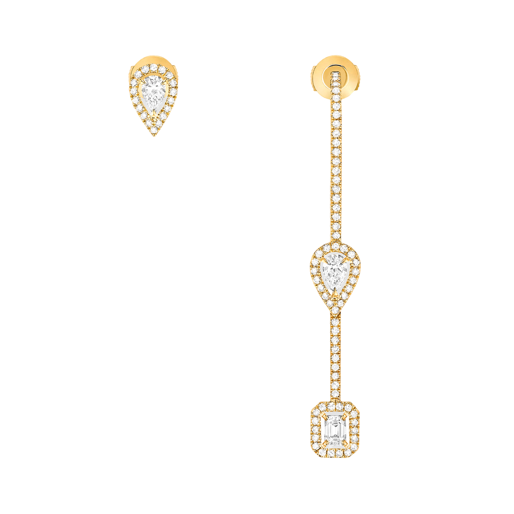 Valérie Messika always says: "Women are multi-faceted, just like diamonds!" Nothing beats a pair of asymmetric yellow gold diamond drop earrings to illustrate these multi-faceted personalities. This pair of handmade diamond drop earrings for women plays on the duality between a pear-cut diamond on one side, enhanced by the elegant pavé diamonds surrounding it, and a yellow gold diamond drop earring on the other side in two parts – one above, one below – that together create the illusion of piercing the ear. You’ll be sure to love the diamond jewelry look of this model, which, with its subtle touch of rock chic, is made to wear day in, day out.