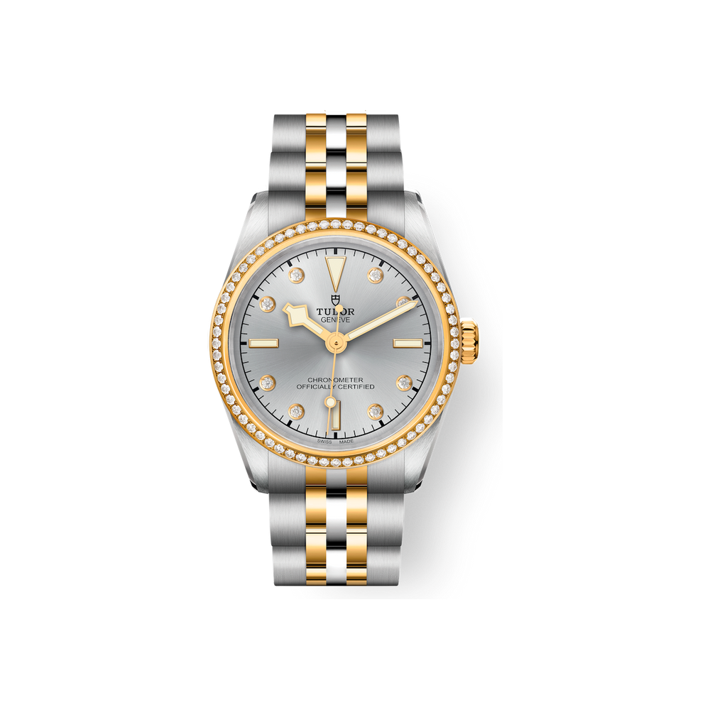 Screw-down winding crown with the TUDOR rose in relief. Steel covered by a 0.1mm yellow gold cap
